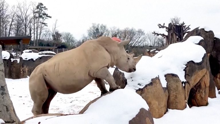 Μια σπάνια χειμωνιάτικη εικόνα καταγράφηκε στο Νόξβιλ του Τενεσί, όταν τέσσερις λευκοί ρινόκεροι βγήκαν από τους εσωτερικούς χώρους του Zoo Knoxville κάνοντας έναν σύντομο «περίπατο» στο χιόνι.