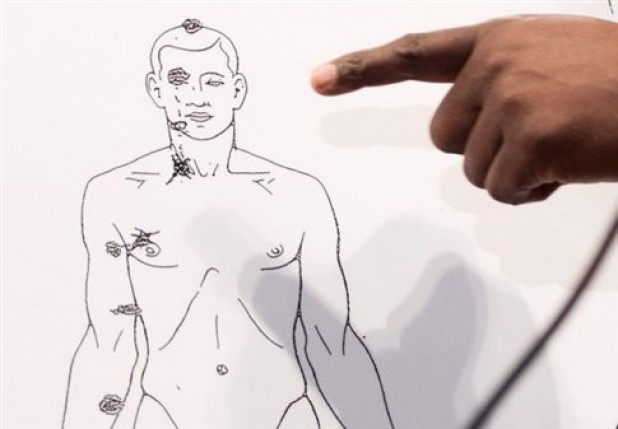 Ο ιατροδικαστής Σον Πάρσελς που συμμετείχε στη νεκροψία, δήλωσε ότι τραύμα στο δεξί χέρι φανερώνει είτε ότι ο νεαρός είχε την πλάτη γυρισμένη στον αστυνομικό, είτε ότι βρισκόταν απέναντί του με τα χέρια υψωμένα πάνω από το κεφάλι του, είτε ότι είχε λάβει σε αμυντική θέση. Ο Μπάντεν δήλωσε ότι «δεν υπήρχαν σημάδια πάλης» στο σώμα του νεαρού και ότι κάποιες εκδορές στη δεξιά πλευρά του προσώπου του έγιναν πιθανότατα μετά τον θάνατό του, όταν έπεσε στο έδαφος.