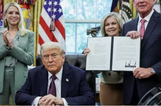Ο Ντόναλντ Τραμπ ανακοίνωσε χθες Δευτέρα ότι υπέγραψε εκτελεστικό προεδρικό διάταγμα που προβλέπει την ανάπτυξη στρατιωτικών της εθνοφρουράς στην πόλη Μέμφις, στην πολιτεία Τενεσί (νότια), στο πλαίσιο της εκστρατείας του στο όνομα της πάταξης της εγκληματικότητας, που βάζει στο στόχαστρο μεγαλουπόλεις όπου κυβερνούν οι δημοκρατικοί (στη φωτογραφία του Reuters/Jonathan Ernst, επάνω, ο Τραμπ, καθιστός, και αριστερά του το υπογεγραμμένο εκτελεστικό διάταγμα).