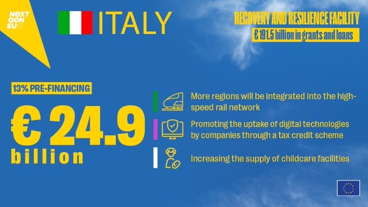 Προχρηματοδότηση ύψους 24,9 δισ. ευρώ για την Ιταλία, στο πλαίσιο του Ταμείου Ανάκαμψης (NextGenerationEU), ενέκρινε σήμερα η Ευρωπαϊκή Επιτροπή.