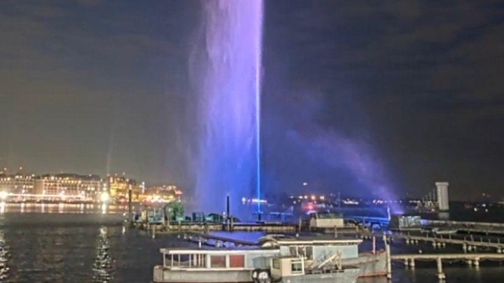 Το πλέον αναγνωρίσιμο σύμβολο της πόλης, που εκτοξεύει νερό σε ύψος 140 μέτρων ντύθηκε στα γαλανόλευκα από τη δύση του ηλίου έως τις 22:30, μετά από σχετική πρωτοβουλία του Γενικού Προξενείου της Γενεύης.