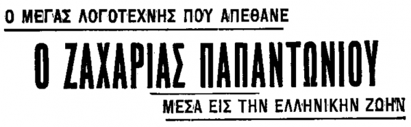 Την 1η Φεβρουαρίου του 1940, ο αιφνίδιος θάνατος του λογοτέχνη Ζαχαρία Παπαντώνιου, σε ηλικία 63 ετών, σόκαρε τον πνευματικό κόσμο της χώρας και ολόκληρο το πανελλήνιο.