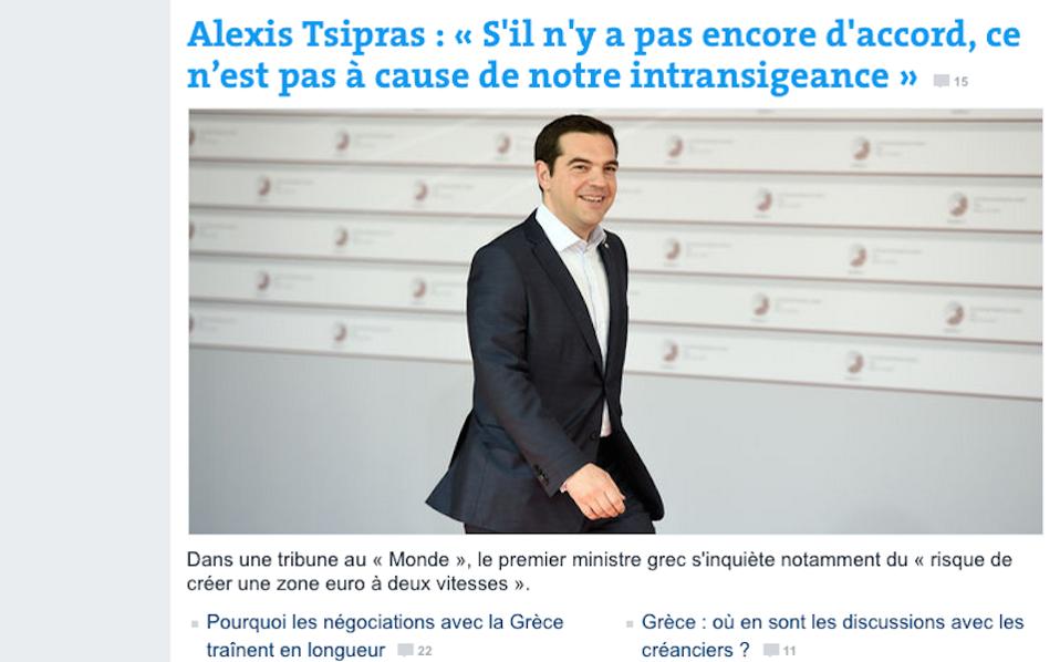 «Η μη επίτευξη συμφωνίας, μέχρι στιγμής, δεν οφείλεται σε μια υποτιθέμενη άτεγκτη, αδιάλλακτη και ακατανόητη στάση της Ελλάδας. Αλλά στην επιμονή ορισμένων θεσμικών παραγόντων να καταθέτουν προτάσεις παράλογες και να δείχνουν παντελή αδιαφορία τόσο στην πρόσφατη δημοκρατική επιλογή του ελληνικού λαού, όσο και στη δημόσια παραδοχή και των τριών θεσμών ότι θα υπάρξει η αναγκαία ευελιξία, ώστε να γίνει σεβαστή η λαϊκή ετυμηγορία», τονίζει ο πρωθυπουργός Αλέξης Τσίπρας σε άρθρο του στη γαλλική εφημερίδα «Λε Μοντ».