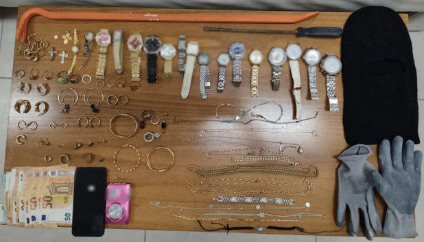 Κατά τη διάρκεια των ερευνών, στην κατοχή του, καθώς και στην οικία του, είχαν βρεθεί και κατασχεθεί συνολικά, πλήθος κοσμημάτων (αλυσίδες, βραχιόλια, σταυροί, ρολόγια κ.α.), φωτογραφική μηχανή, κινητό τηλέφωνο, καθώς και το χρηματικό ποσό των 510 ευρώ. Επιπλέον, σε Ι.Χ. αυτοκίνητο, που χρησιμοποιούσε, το οποίο επίσης, κατασχέθηκε, βρέθηκαν σκούφος full face, γάντια και διαρρηκτικά εργαλεία (λοστός και κατσαβίδι).
