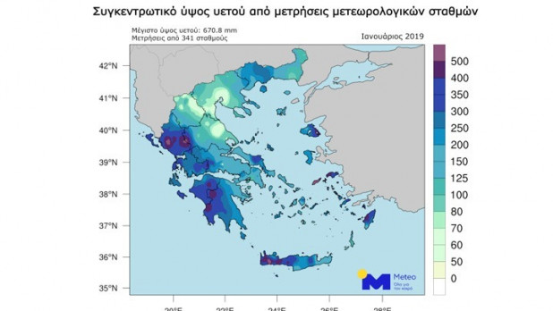 Πολύ μεγάλα ύψη βροχοπτώσεων καταγράφηκαν τον Ιανουάριο του 2019 σε ολόκληρη σχεδόν την Ελλάδα, σύμφωνα με την μετεωρολογική υπηρεσία meteo του Εθνικού Αστεροσκοπείου Αθηνών (ΕΑΑ).