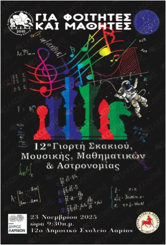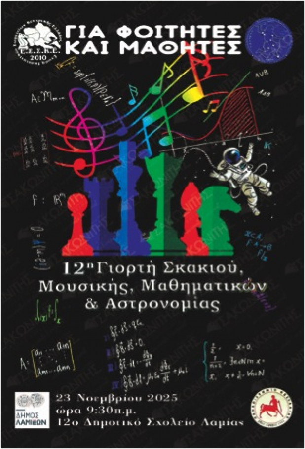 Το 12ο Δημοτικό Σχολείο Λαμίας, η Ένωση Σκακιστικών Σωματείων Κεντρικής Ελλάδας (ΕΣΣΚΕ), το Τμήμα Μαθηματικών του Πανεπιστημίου Θεσσαλίας, η Διεύθυνση Πρωτοβάθμιας Εκπαίδευσης Φθιώτιδας, τα Γενικά Αρχεία του Κράτους Φθιώτιδας (ΓΑΚ) και ο Δήμος Λαμιέων συνδιοργανώνουν την «12η Γιορτή Σκακιού και Επιστημών», την Κυριακή 23 Νοεμβρίου 2025, στο 12ο Δημοτικό Σχολείο Λαμίας.