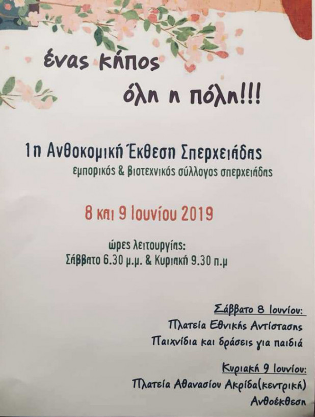 Ο Εμπορικός και Βιοτεχνικός Σύλλογος Σπερχειάδας διοργανώνει την 1η Ανθοκομική Έκθεση Σπερχειάδας η οποία θα είναι διήμερη.