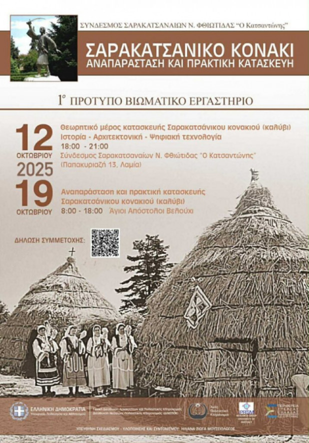 Ο Σύνδεσμος Σαρακατσαναίων Νομού Φθιώτιδας «Ο Κατσαντώνης» καλεί όλα τα μέλη του και φίλους στο 1ο Πρότυπο Βιωματικό Εργαστήριο Κατασκευής Σαρακατσάνικου Κονακιού (καλύβι) με τίτλο «Ζωντανό Κονάκι: Αλληλοεπιδρώντας με το χθες και το σήμερα των Σαρακατσάνων».