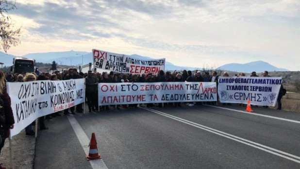 ΛΑΡΚΟ στα Σέρβια, παρέταξαν 100 φορτηγά κατά μήκος του δρόμου, διαμαρτυρόμενοι για την απόφαση της κυβέρνησης να θέσει σε εκκαθάριση την εταιρεία και ζητώντας να τους πληρωθούν υπηρεσίες που παρασχέθηκαν τους τελευταίους πέντε μήνες, ύψους 5 εκατ. ευρώ.