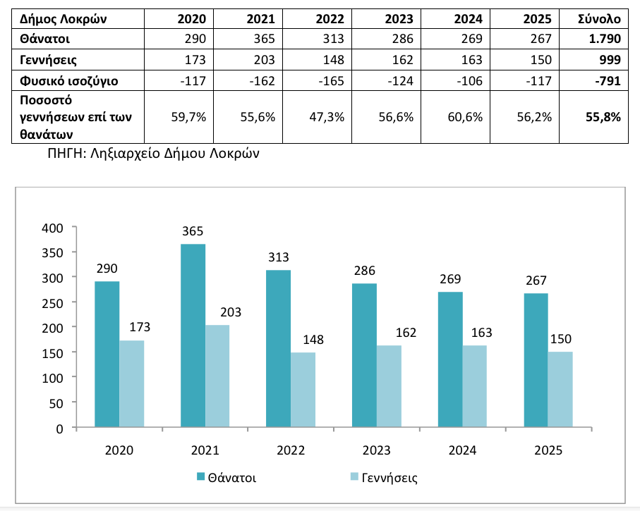 Το φυσικό ισοζύγιο του Δήμου Λοκρών για την περίοδο 2020-2025 είναι αρνητικό. Ειδικότερα την περίοδο αυτή καταγράφηκαν 999 γεννήσεις και 1.790 θάνατοι, με τις γεννήσεις να αντιπροσωπεύουν μόλις το 55,8% των θανάτων. Το 2025 οι θάνατοι ανήλθαν σε 267, το χαμηλότερο επίπεδο των τελευταίων έξι ετών και οι γεννήσεις ανήλθαν σε μόλις 150 παιδιά, το δεύτερο χαμηλότερο πλήθος των τελευταίων 6 ετών. Το αρνητικό φυσικό ισοζύγιο στο 2025 ήταν 117 άτομα.