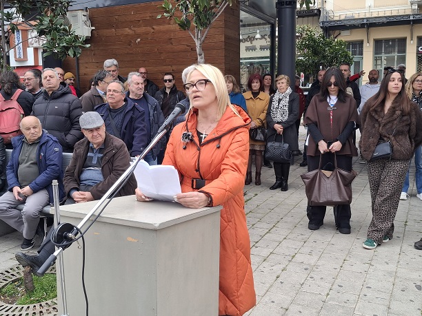 Παρούσα στη συγκέντρωση, ήταν η Παναγιώτα Κατόπη, μητέρα τραυματία από εκείνη τη βραδιά, η οποία ανέγνωσε το μήνυμα της ημέρας από την ανακοίνωση που έδωσαν στη δημοσιότητα τα μέλη του Συλλόγου Συγγενών Θυμάτων Τεμπών 2023.