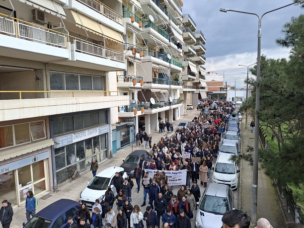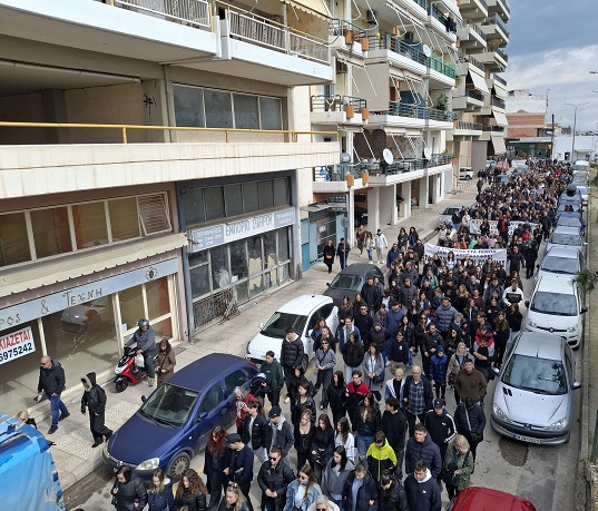 Μετά τη συγκέντρωση, ακολούθησε συμβολική πορεία, μέσω των κεντρικών δρόμων της πόλης, προς το κτήριο του ΟΣΕ, εκεί όπου αναγνώστηκαν τα ονόματα των 57 αδικοχαμένων ανθρώπων.