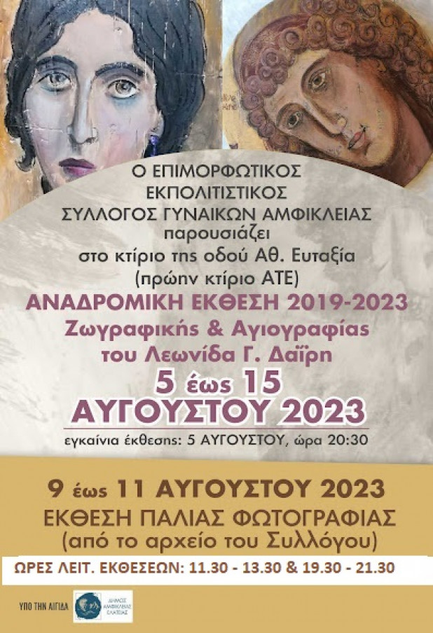 Τα εγκαίνια της Έκθεσης Ζωγραφικής & Αγιογραφίας του Λεωνίδα Γ. Δαΐρη, πραγματοποιεί το Σάββατο, 5 Αυγούστου στις 20:30, ο Επιμορφωτικός Εκπολιτιστικός Σύλλογος Γυναικών Αμφίκλειας στο πρώην κτίριο ΑΤΕ Αμφίκλειας.
