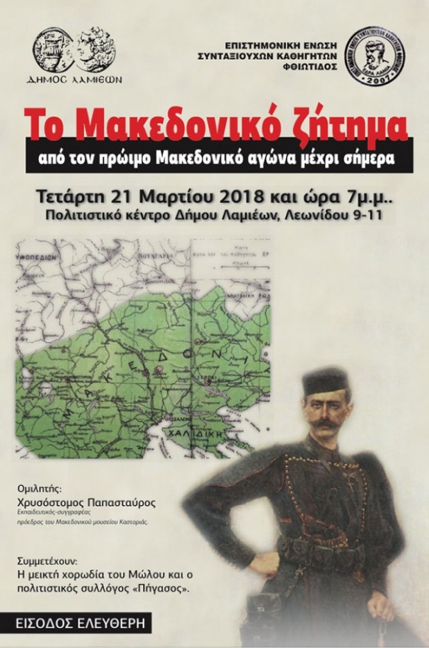 Εκδήλωση με θέμα «Το Μακεδονικό ζήτημα από τον πρώιμο Μακεδονικό Αγώνα μέχρι σήμερα» θα πραγματοποιηθεί σήμερα Τετάρτη, στις 7:00 το απόγευμα, στο Πολιτιστικό Κέντρο του Δήμου Λαμιέων.