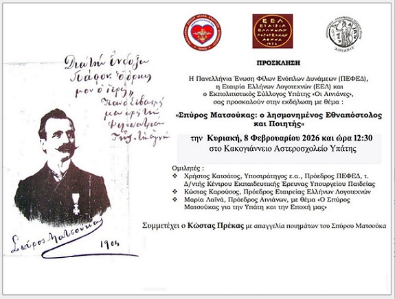 Εκδήλωση με θέμα: «Σπύρος Ματσούκας: ο λησμονημένος Εθναπόστολος και Ποιτητής» θα πραγματοποιηθεί την Κυριακή, 8 Φεβρουαρίου 2026 και ώρα 12:30μ.μ. στο Κακογιάννειο Αστεροσχολείο Υπάτης από την Πανελλήνια Ένωση Φίλων Ενόπλων Δυνάμεων (ΠΕΦΕΔ), την Εταιρία Ελλήνων Λογοτεχνών (ΕΕΛ) και τον Εκπολιτιστικό Σύλλογο Υπάτης «Οι Αινιάνες».