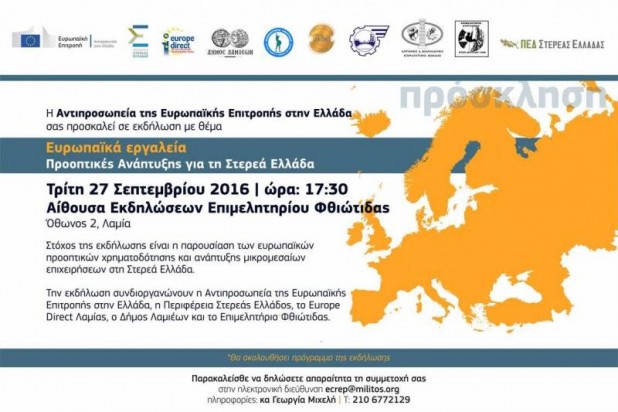 Εκδήλωση για «Ευρωπαϊκά εργαλεία- Προοπτικές Ανάπτυξης για τη Στερεά Ελλάδα» διοργανώνουν την Τρίτη 27 Σεπτεμβρίου, η Αντιπροσωπεία της Ευρωπαϊκής Επιτροπής στην Ελλάδα, ο Δήμος Λαμιέων, η Περιφέρεια Στερεάς Ελλάδας, το Κέντρο Ευρωπαϊκής Πληροφόρησης Europe Direct Λαμίας και το Επιμελητήριο Φθιώτιδας.