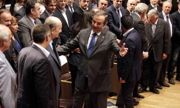 «Είμαι εδώ για να εγγυηθώ ότι η χώρα θα φτάσει στο λιμάνι της ασφάλειας και της σταθερότητας, χωρίς να κινδυνεύσουν ούτε οι θυσίες που έγιναν μέχρι σήμερα, ούτε και η ανάκαμψη που ήδη έχει αρχίσει, είμαι εδώ για να μην επιτρέψουμε σε κανένα να θέσει σε κίνδυνο ή σε αμφισβήτηση τη θέση της Ελλάδας στην Ευρώπη» τόνισε ο κ. Σαμαράς
