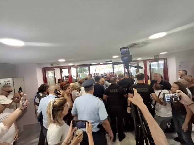 Την ώρα του αγιασμού των νέων ΤΕΠ, διαμαρτυρόμενοι φωνάζοντας συνθήματα επιχείρησαν να εισέλθουν στον χώρο της εκδήλωσης και απωθήθηκαν από την Αστυνομία.