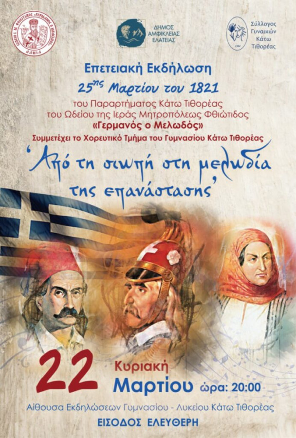 Επετειακή Εκδήλωση για την 25η Μαρτίου του 1821 με τίτλο: «Από τη σιωπή στη μελωδία της επανάστασης», διοργανώνει ο Δήμος Αμφίκλειας – Ελάτειας σε συνεργασία με το Παράρτημα Κάτω Τιθορέας του Ωδείου της Ιεράς Μητροπόλεως Φθιώτιδος “ΓΕΡΜΑΝΟΣ ο ΜΕΛΩΔΟΣ” και τον Σύλλογο Γυναικών Κάτω Τιθορέας, η οποία θα πραγματοποιηθεί την Κυριακή 22 Μαρτίου 2026 και ώρα 20:00 στην αίθουσα εκδηλώσεων του Γυμνασίου – Λυκείου Κάτω Τιθορέας.