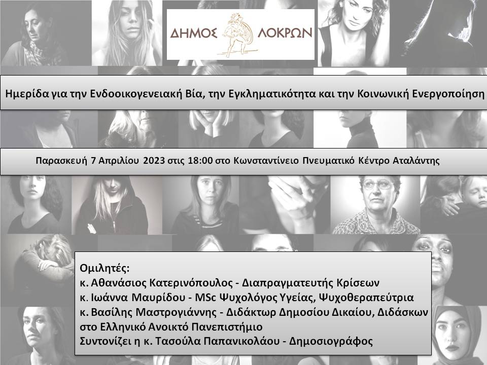 Ημερίδα για την Ενδοοικογενειακή Βία, την Εγκληματικότητα και την Κοινωνική Ενεργοποίηση θα πραγματοποιηθεί την επόμενη εβδομάδα στο Δήμο Λοκρών.