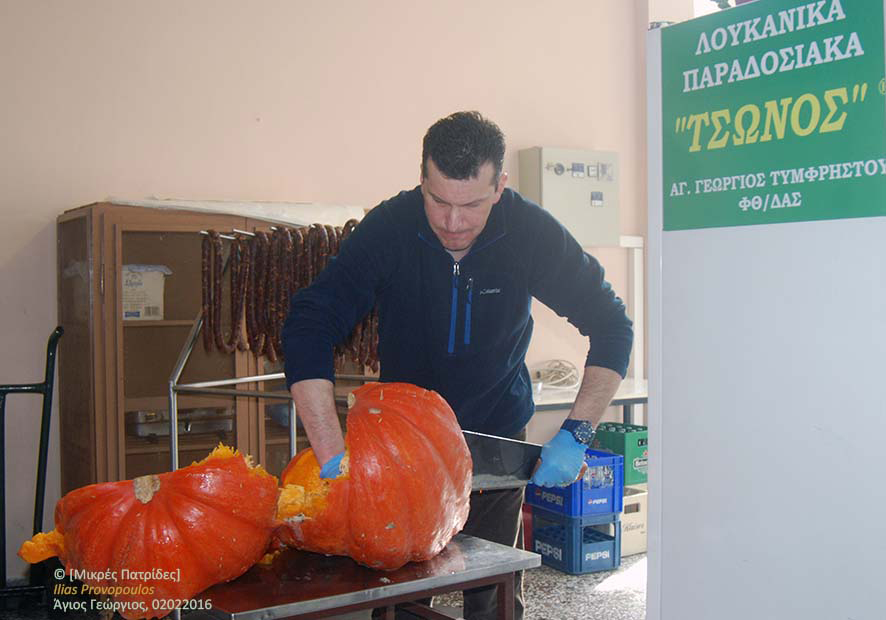 Βλαστάρι της γης του Σπερχειού το μεγάλο κολοκύθι το μάζεψε ο Γιώργος Τσώνος τον Αύγουστο που μας πέρασε από ένα χωράφι του κάμπου και το φρόντισε μέχρι τώρα αλλά η παγωνιά που πλάκωσε και στην περιοχή το έλιωσε κι έτσι κρίθηκε επιτακτική η σφαγή του για να μαζέψουμε τουλάχιστον το σπόρο του. Γι’ αυτό και σήμερα το βάλαμε στον πάγκο και ακολούθησαν τα δέοντα αλλά χωρίς να ακούσουμε κραυγές και να δούμε αίματα, μόνο ζουμιά έτρεξαν και μια βαριά μυρωδιά γονιμότητας που ανέδυε η βαριά σάρκα του.