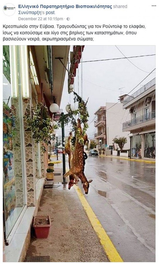 Το γύρο του διαδικτύου κάνει η φωτογραφία δύο σκοτωμένων ελαφιών, που ήταν κρεμασμένα σε τσιγκέλια έξω από κρεοπωλείο στα Ψαχνά Ευβοίας.