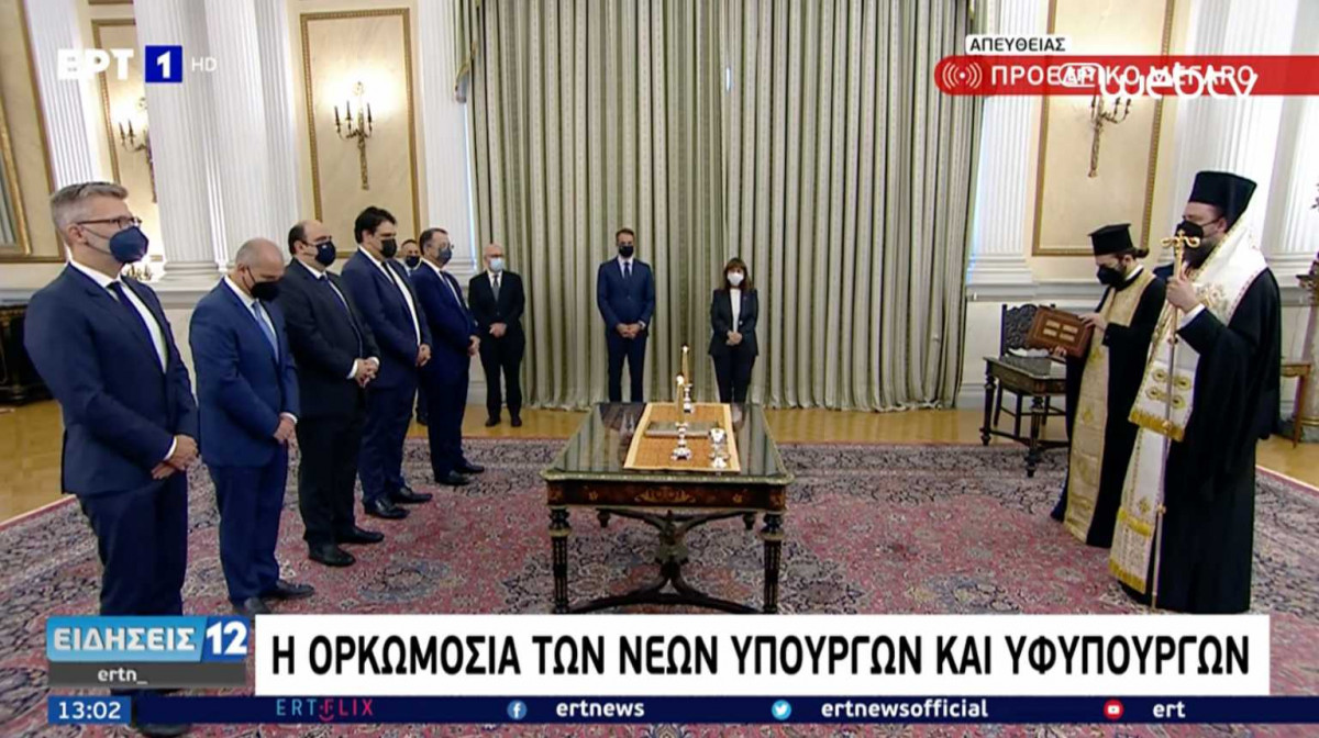 Οι νέοι υπουργοί ορκίστηκαν με θρησκευτικό όρκο ενώπιον της Προέδρου της Δημοκρατίας Κατερίνας Σακελλαροπούλου και παρουσία του πρωθυπουργού Κυριάκου Μητσοτάκη.