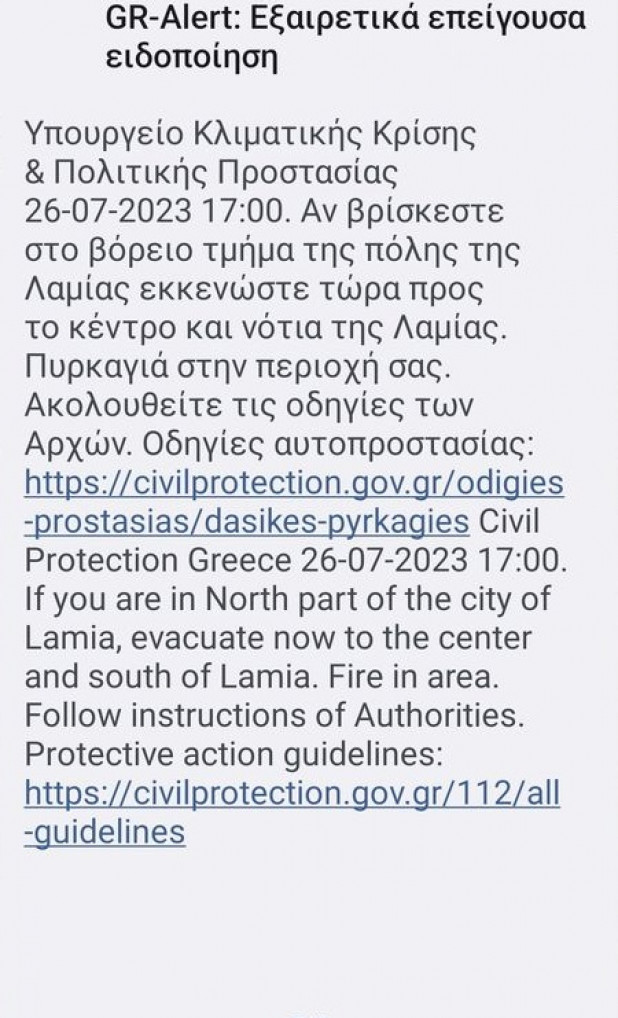 «Αν βρίσκεστε στο βόρειο τμήμα της πόλης της Λαμίας εκκενώστε τώρα προς το κέντρο και νότια της Λαμίας. Πυρκαγιά στην περιοχή σας. Ακολουθείτε τις οδηγίες των αρχών».