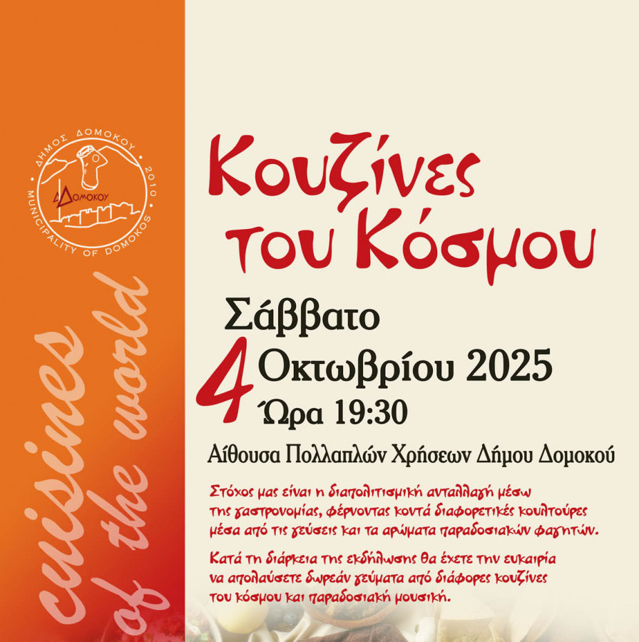 Ο Δήμος Δομοκού διοργανώνει μια μοναδική γαστρονομική και πολιτιστική εκδήλωση, τις "Κουζίνες του Κόσμου", με στόχο την προώθηση της διαπολιτισμικής ανταλλαγής μέσω της γαστρονομίας.