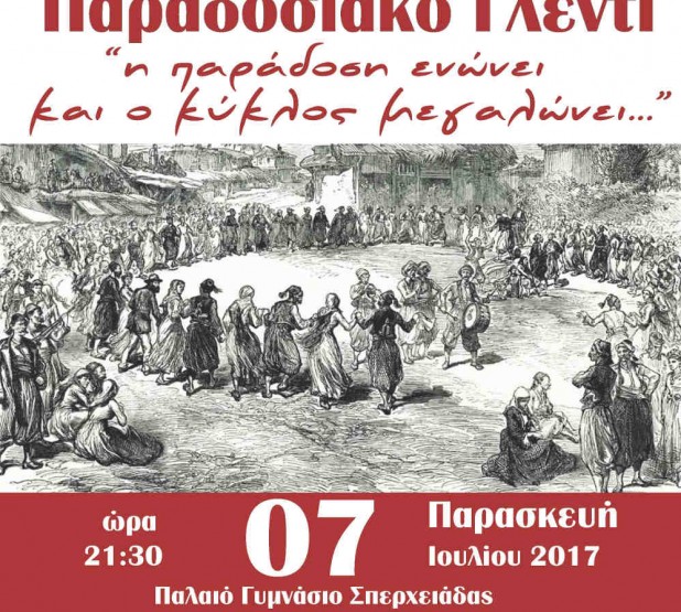 Με σύνθημα «Η παράδοση ενώνει και ο κύκλος μεγαλώνει..» ο Λαογραφικός Χορευτικός όμιλος Σπερχειάδας διοργανώνει «Παραδοσιακό Γλέντι» με ζωντανή μουσική και ατελείωτο χορό την Παρασκευή 7 Ιουλίου και ώρα 21:30, στον προαύλιο χώρο του Παλαιού Γυμνασίου Σπερχειάδας.