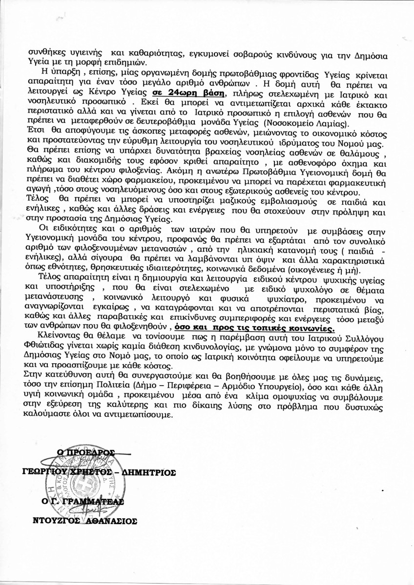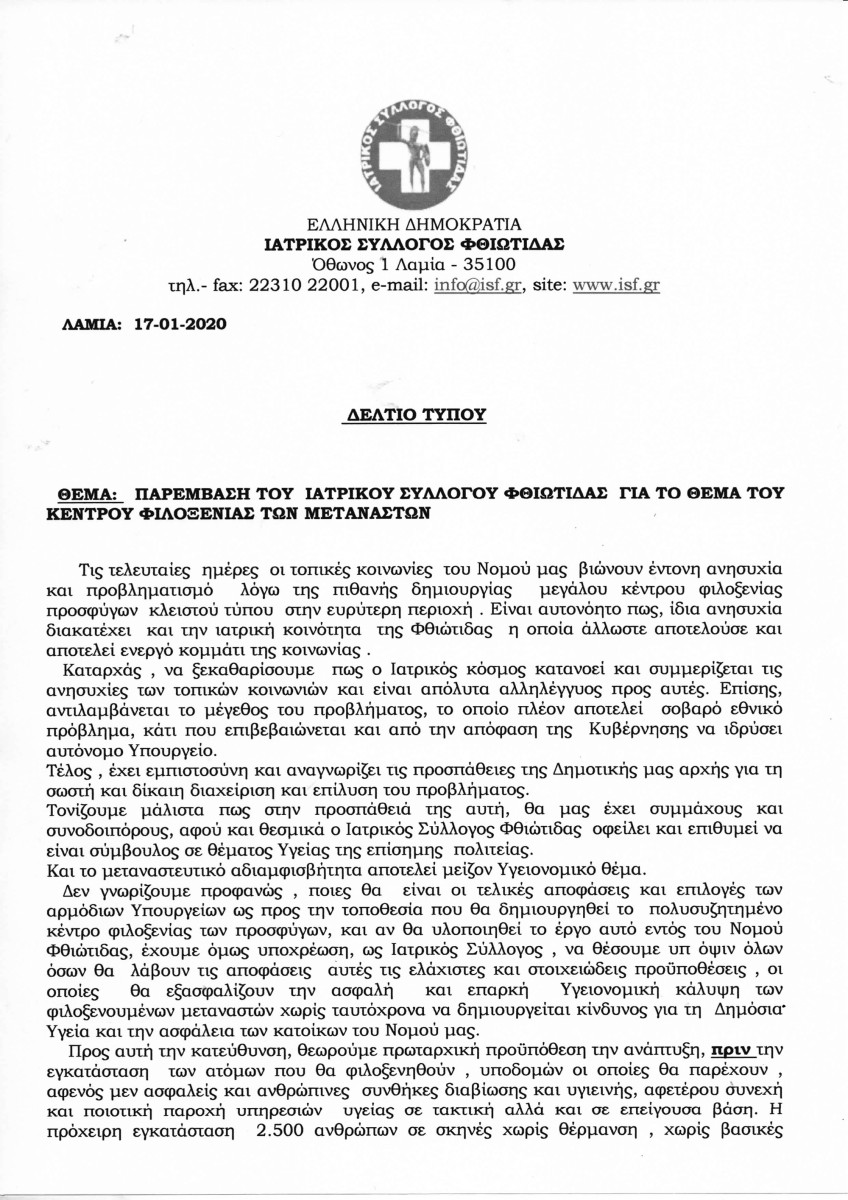 Παρέμβαση για το θέμα του Κέντρου Φιλοξενίας Μεταναστών στην περιοχή μας, έκανε ο Ιατρικός Σύλλογος Φθιώτιδας. Συγκεκριμένα αναφέρει:
