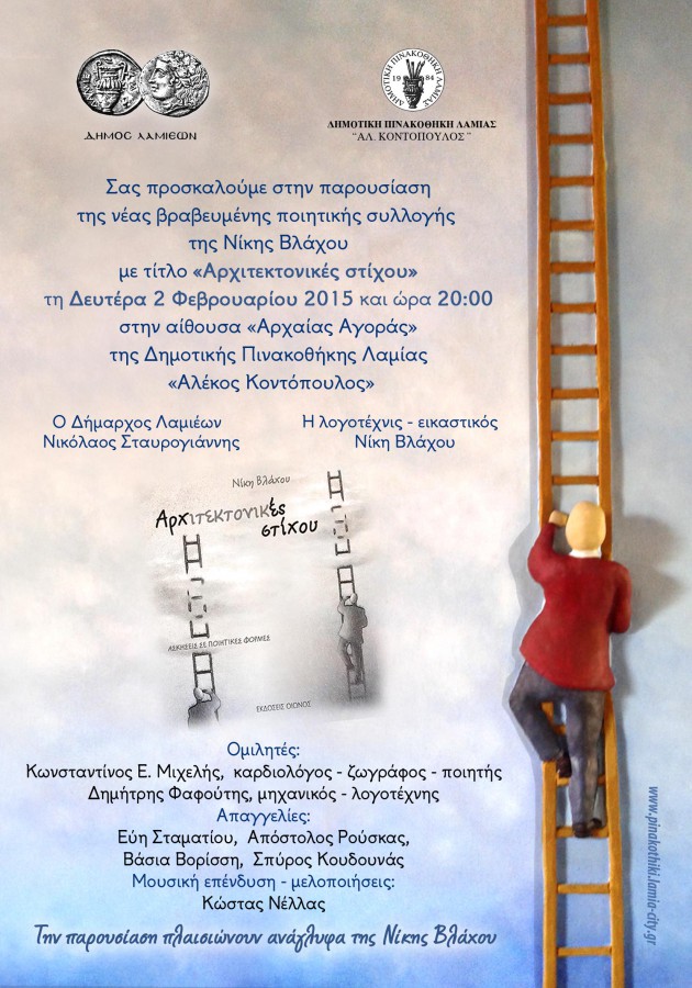 Η νέα βραβευμένη ποιητική συλλογή της Νίκης Βλάχου «Αρχιτεκτονικές στίχου» παρουσιάζεται τη Δευτέρα 2 Φεβρουαρίου 2015 στις 8.00 το απόγευμα στην αίθουσα «Αρχαίας Αγοράς» της Δημοτικής Πινακοθήκης Λαμίας «Αλέκος Κοντόπουλος».