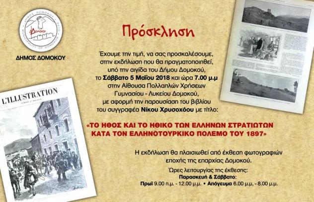 Το Σάββατο (5/5) το απόγευμα, θα πραγματοποιηθεί η εκδήλωση της παρουσίασης του βιβλίου του συγγραφέα, Νίκου Χρυσοχόου με τίτλο: «Το ήθος και το ηθικό των Ελλήνων Στρατιωτών κατά τον Ελληνοτουρκικό πόλεμο του 1897» που τελεί υπό την αιγίδα του Δήμου Δομοκού.