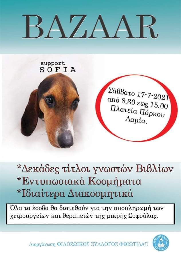Ο Φιλοζωικός Σύλλογος Φθιώτιδας σας καλεί να στηρίξετε το παζάρι που διοργανώνει το Σάββατο 17-7-2021 και ώρες από 8.30 έως 15.00 στην Πλατεία Πάρκου στη Λαμία.