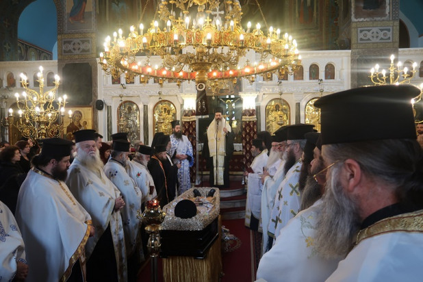 Στις 15:30 το μεσημέρι, στο Ναό μετέβη και ο Σεβασμιώτατος Μητροπολίτης μας κ. Συμεών, ο οποίος και προηξήρχε της Εξοδίου Ακολουθίας, πλαισιούμενος από τον Καθηγούμενο της Ιεράς Μονής Μεταμορφώσεως του Σωτήρος Καμένων Βούρλων, Πανοσιολ. Αρχιμ. π. Σεραφείμ Μαργαρίτου, τον Αρχιερατικό Επίτροπο Αταλάντης και Ιεροκήρυκα Λοκρίδος Πανοσιολ. Αρχιμ. π. Δημήτριο Ζελιαναίο, τον Αρχιερατικό Επίτροπο Μενδενίτσης και Καμένων Βούρλων, Αιδεσιμολ. Πρωτ. π. Κωνσταντίνο Ρεντίφη, τον Αρχιερατικό Επίτροπο Οπουντίων και Μαλεσίνης Αιδεσιμολ. Πρωτ. π. Αθανάσιο Λατσούδη και άπαντες τους Ιερείς της Λοκρίδος.