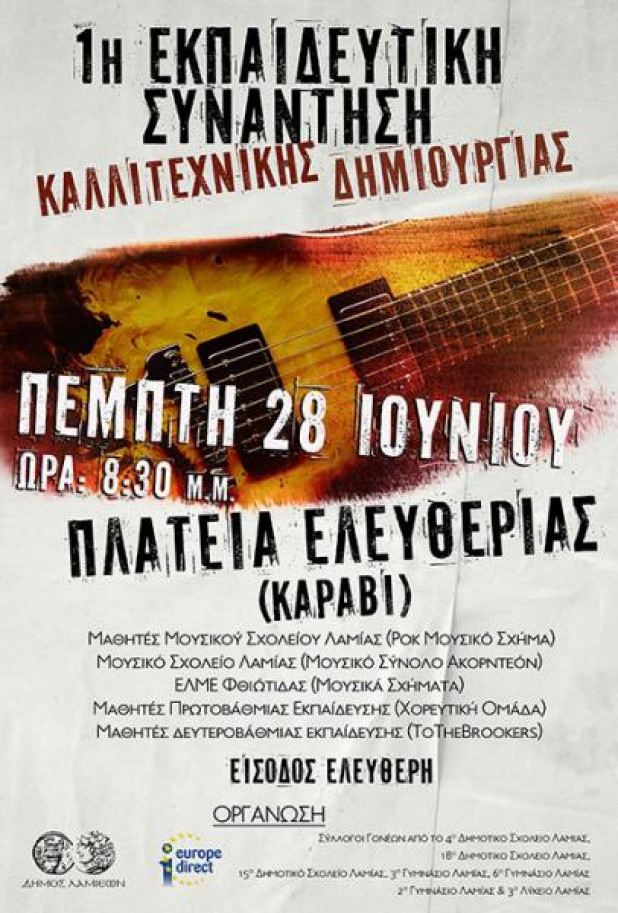 Ο Δήμος Λαμιέων και το Κέντρο Ευρωπαϊκής Πληροφόρησης Europe Direct Λαμίας σε συνεργασία με τους Συλλόγους Γονέων του 4ου, του 15ου, του 18ου Δημοτικού Σχολείου, του 2ου, του 3ου, του 6ου Γυμνασίου και του 3ου Λυκείου Λαμίας, διοργανώνουν την «1η Εκπαιδευτική Συνάντηση Καλλιτεχνικής Δημιουργίας» όπου θα δοθεί η ευκαιρία καλλιτεχνικής έκφρασης σε εκπαιδευτικούς και μαθητές.