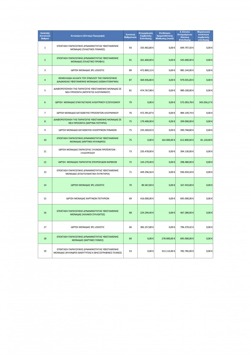 Τα επενδυτικά σχέδια συνολικού ύψους 12.392.401,74 ευρώ κατατέθηκαν στη Διεύθυνση Αναπτυξιακού Προγραμματισμού της Περιφέρειας Στερεάς Ελλάδας, κατόπιν σχετικής προκήρυξης.  Σύμφωνα με τον συνημμένο πίνακα το συνολικό ποσό της επιχορήγησης ανέρχεται σε 5.588.516,61 ευρώ, ενω το συνολικό ποσό της ενίσχυσης (με τη μορφή της φορολογικής απαλλαγής) ανέρχεται σε 426.176,27 ευρώ.