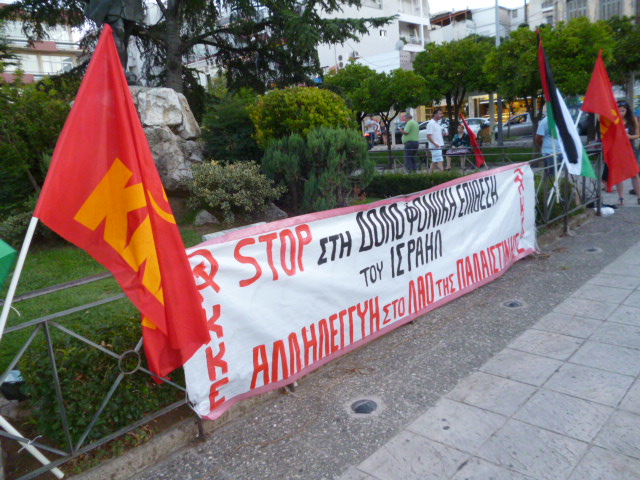 Τον αποτροπιασμό τους για τα αιματηρά γεγονότα στη Λωρίδα της Γάζας εξέφρασαν απόψε το βράδυ μέλη των κομουνιστικών οργανώσεων στη Φθιώτιδα σε συγκέντρωση διαμαρτυρίας στην Πλατεία Πάρκου, καταδικάζοντας παράλληλα την βάρβαρη και εγκληματική επίθεση του Ισραήλ σε βάρος του Παλαιστινιακού λαού.
