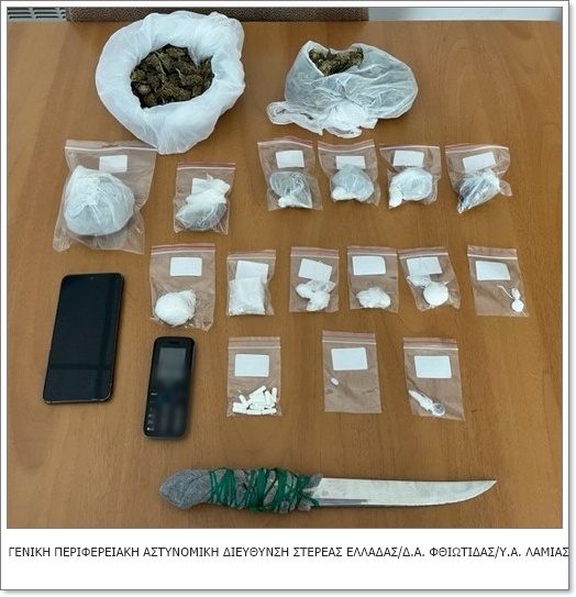 Συνελήφθη ημεδαπός σε περιοχή της Φθιώτιδας, από αστυνομικούς του Τμήματος Δίωξης Ναρκωτικών της Υποδιεύθυνσης Ασφαλείας Λαμίας, για παραβάσεις νομοθεσιών περί ναρκωτικών και όπλων.Κατασχέθηκαν κοκαΐνη, ακατέργαστη κάνναβη, ναρκωτικά δισκία, μαχαίρι, κινητά τηλέφωνα και Ι.Χ.Ε. αυτοκίνητ