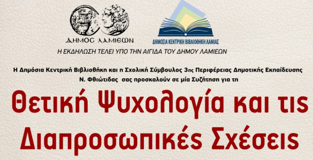 Η Δημόσια Κεντρική Βιβλιοθήκη Λαμίας και η Σχολική Σύμβουλος της 3ης Περιφέρειας Δημοτικής Εκπαίδευσης Ν. Φθιώτιδας πραγματοποιούν συζήτηση για τη Θετική Ψυχολογία και τις Διαπροσωπικές Σχέσεις στην κύρια αίθουσα της Δημοτικής Πινακοθήκης Αλέκος Κοντόπουλος την Κυριακή 18 Μαρτίου 2018 και ώρα 6.30 μ.μ.