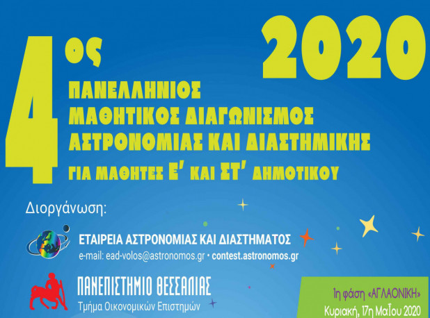 Την Κυριακή 17 Μαΐου 2020 και ώρα 12 το μεσημέρι διεξάγεται διαδικτυακά η πρώτη φάση «Αγλαονίκη» του 4ου Πανελληνίου Μαθητικού Διαγωνισμού Αστρονομίας και Διαστημικής σε όλη την Ελλάδα.