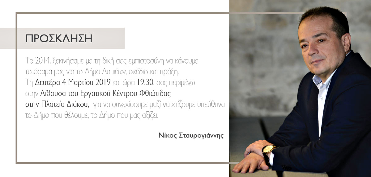 Την Δευτέρα 4 Μαρτίου 2019 και ώρα 19:30 σας περιμένω στην Αίθουσα του Εργατικού Κέντρου Φθιώτιδας, στην Πλατεία Διάκου, για να συνεχίσουμε μαζί να χτίζουμε τον Δήμο που θέλουμε, τον Δήμο που μας αξίζει” αναφέρει στη σχετική πρόσκληση που δημοσιοποίησε ο Δήμαρχος Λαμιέων.