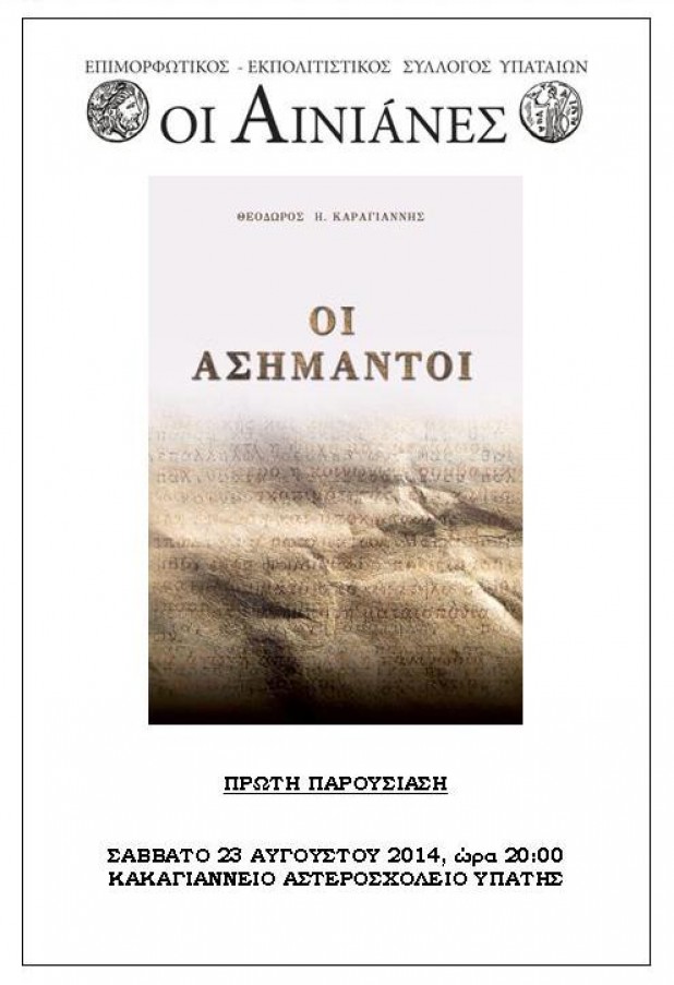 Ο Εκπολιτιστικός - Επιμορφωτικός Σύλλογος Υπαταίων «ΟΙ ΑΙΝΙΑΝΕΣ» πραγματοποιεί εκδήλωση παρουσίασης του βιβλίου του συντοπίτη μας, Θεόδωρου Καραγιάννη με τίτλο «ΟΙ ΑΣΗΜΑΝΤΟΙ», αύριο Σάββατο 23 Αυγούστου 2014 και ώρα 20.00 στο Αμφιθέατρο του Κακογιάννειου Αστεροσχολείου Υπάτης.