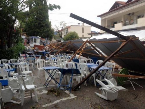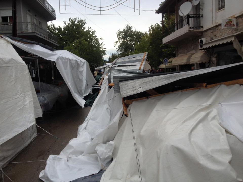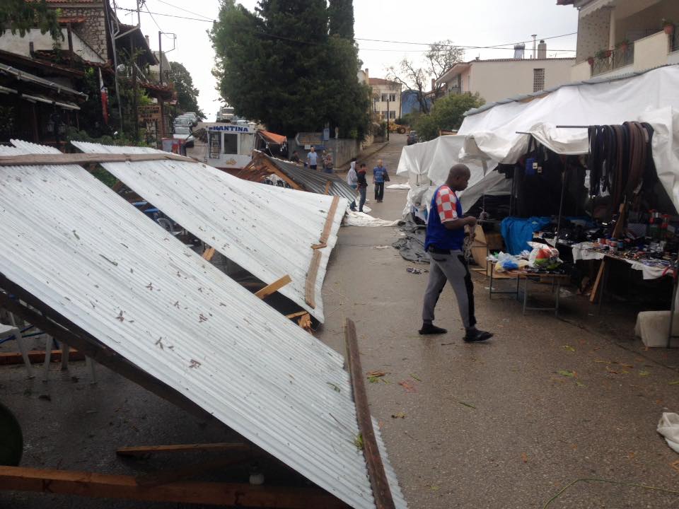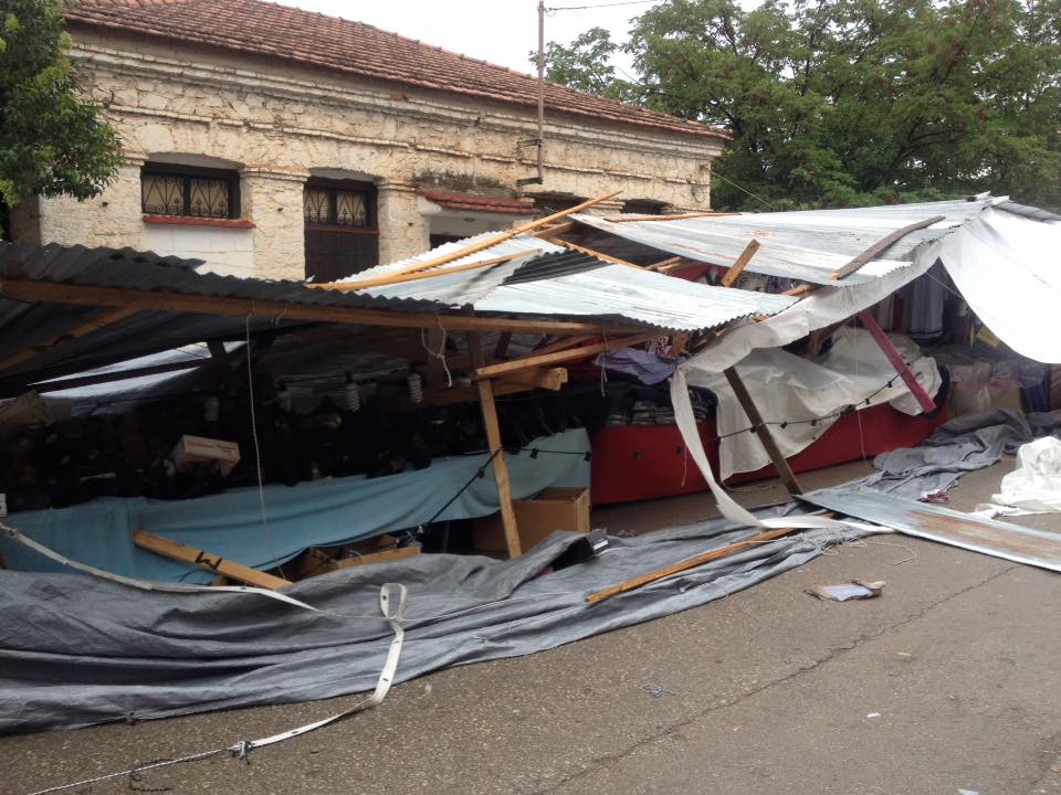 Ο δυνατός αέρας σήκωσε κυριολεκτικά στον αέρα τις τσίγκινες στέγες και σκόρπισε στο έδαφος τις πρόχειρες κατασκευές και τα εμπορεύματα στο παζάρι της Αμφίκλειας το πρωί της Δευτέρας. Ευτυχώς, που δεν υπήρξαν τραυματισμοί γιατί μέσα στις παράγκες κοιμόντουσαν άνθρωποι. Από τύχη δεν είχαμε τραυματισμούς.