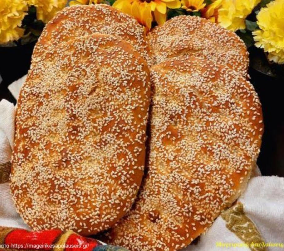 5. Όταν έχει φουσκώσει η ζύμη, πριν την βάλουμε στο φούρνο, την αλείφουμε τη το αραιωμένο μέλι σε νερό. Πασπαλίζουμε με σουσάμι. Με λαδωμένα δάχτυλα κάνουμε τρυπούλες.