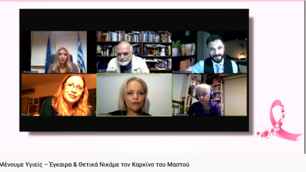 Διαδικτυακή εκδήλωση με τίτλο «Μένουμε Υγιείς - Έγκαιρα και Θετικά Νικάμε τον Καρκίνο του Μαστού» διοργάνωσε η Γενική Γραμματεία Οικογενειακής Πολιτικής και Ισότητας των Φύλων, με αφορμή τον παγκόσμιο μήνα ευαισθητοποίησης. Ο Ευάγγελος Φιλόπουλος, πρόεδρος της Ελληνικής Αντικαρκινικής Εταιρείας και διευθυντής της Κλινικής Μαστού του Νοσοκομείου «'Αγιος Σάββας» και ο ψυχίατρος - ψυχοθεραπευτής, Δημήτρης Παπαδημητριάδης ενημέρωσαν σχετικά με τις ιατρικές όψεις της πρόκλησης του καρκίνου του μαστού, ενώ η συγγραφέας Σοφία Νικολαΐδου και η παγκοσμίου φήμης φωτογράφος, Καλλιόπη Καρβούνη κατέθεσαν το προσωπικό τους βίωμα ως γυναίκες που νίκησαν την μάχη.