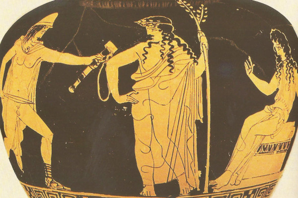 • Εικόνα: Ο Ορέστης διεκδικεί την Ερμιόνη από τον Νεοπτόλεμο (Ερυθρόμορφη οινοχόη. Γύρω στο 520 π.χ. Kassel Staatliche Kunstsammlungen)