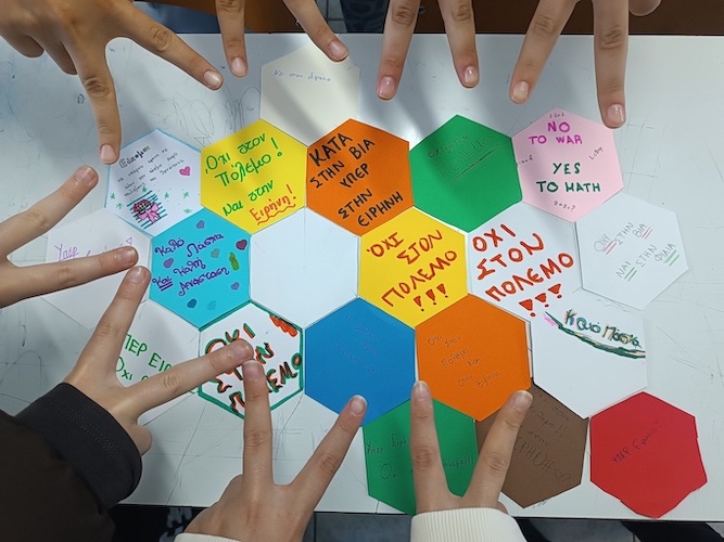 Στο πλαίσιο του μαθήματος των Μαθηματικών, οι μαθητές κατασκεύασαν κανονικά εξάγωνα, αξιοποιώντας τις γνώσεις τους σχετικά με τις κεντρικές γωνίες και τη γεωμετρία του κύκλου. Στη συνέχεια, κάθε μαθητής δημιούργησε το δικό του έργο, γράφοντας ένα προσωπικό μήνυμα για τον πόλεμο και την ειρήνη και διακοσμώντας το με χρώματα και συμβολικά σχέδια.