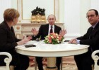 Οι διαπραγματεύσεις μεταξύ του προέδρου της Ρωσίας Βλαντίμιρ Πούτιν, του Γάλλου ομολόγου του Φρανσουά Ολάντ και της καγκελαρίου της Γερμανίας Άγγελα Μέρκελ με...