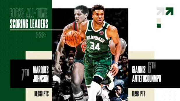 Μάλιστα ο Αντετοκούνμπο ξεπέρασε τους 11.000 πόντους με τη φανέλα των Μπακς (11.007) και ανέβηκε στην 6η θέση της σχετικής λίστας ξεπερνώντας τον Μαρκίς Τζόνσον.